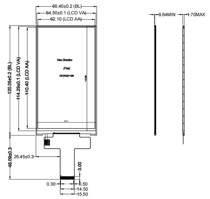 Благодаря яркости до 300 кд/м² и толщине всего 1,85 мм (66,40 × 120,05 мм) дисплей имеет активную область отображения 62,06 × 110,42 мм и 30-контактный разъем FPC для простой интеграции, что делает небольшой сенсорный модуль TFT IPS TFT с диагональю 5,0 дюйма идеальным для портативных устройств высокого класса, автомобильных дисплеев и потребительских товаров премиум-класса. электроника.